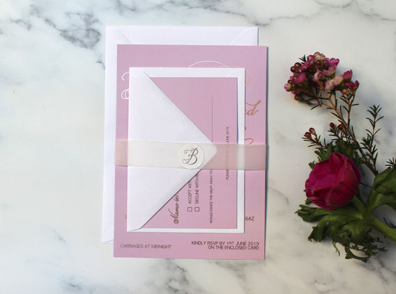 Shown here is rose gold foil on dusty pink velvet-finished card with white laid envelopes.